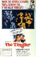 A coroner played by Vincent Price discovers that fear causes a creature to grow on a persons spine. He discovers this during an autopsy on a deaf-mute girl - Judith Evelyn - who has died from fright (should have bought insurance). Price captures the creature, but it gets loose in a theater, presumably the one where you are viewing the movie. Lots of experiments, a bad LSD trip (the films only color sequence) and screaming make this a classic thriller. This is probably the best known of Castle's films due to his creative use of a gimmick he called Percepto (see below). A nice are available from the Dewey Web. The GimmickPercepto - This effect involved rigging selected theater seats with a vibrating buzzer unit under the seat. At predetermined times during the film the projectionist would set off these "tinglers", resulting in lots of screaming. A special crew traveled the country setting up theaters for this effect. TidbitsIn all William Castle estimates they probably buzzed 20,000,000 bottoms through the full run of this film in theaters. Also of note - Judith Evelyn must hold the distinction of being the only Castle movie heroin NOT to scream. |